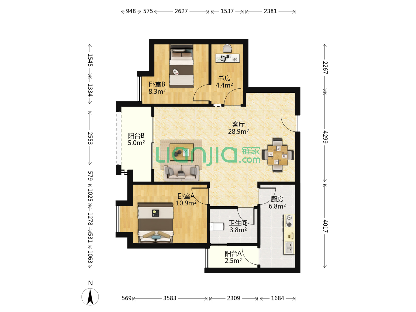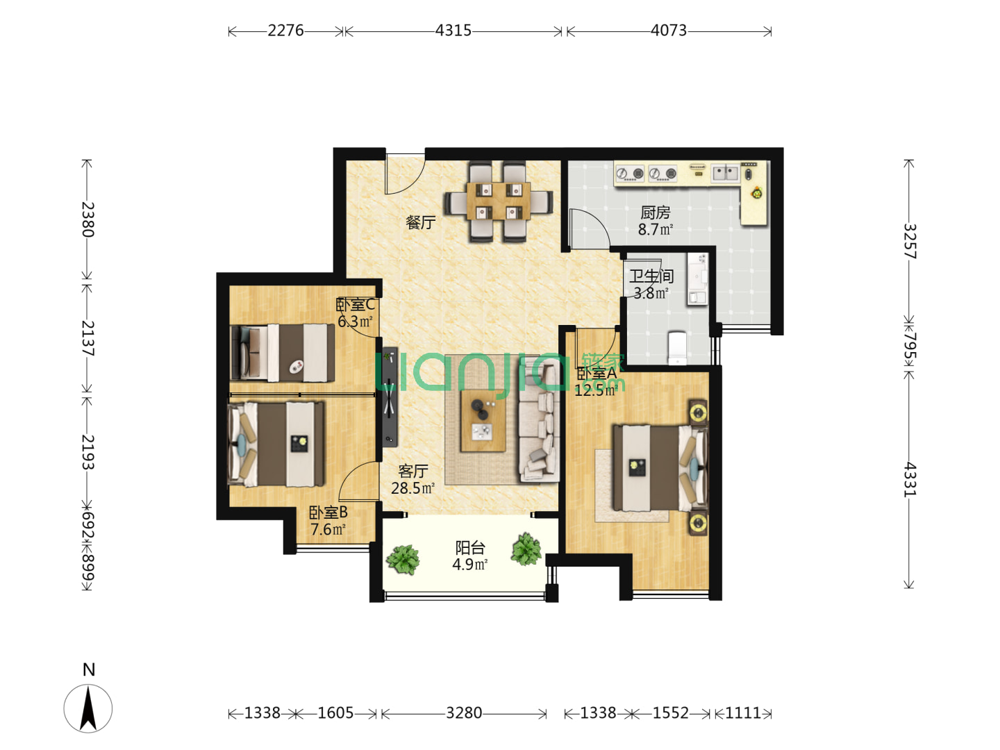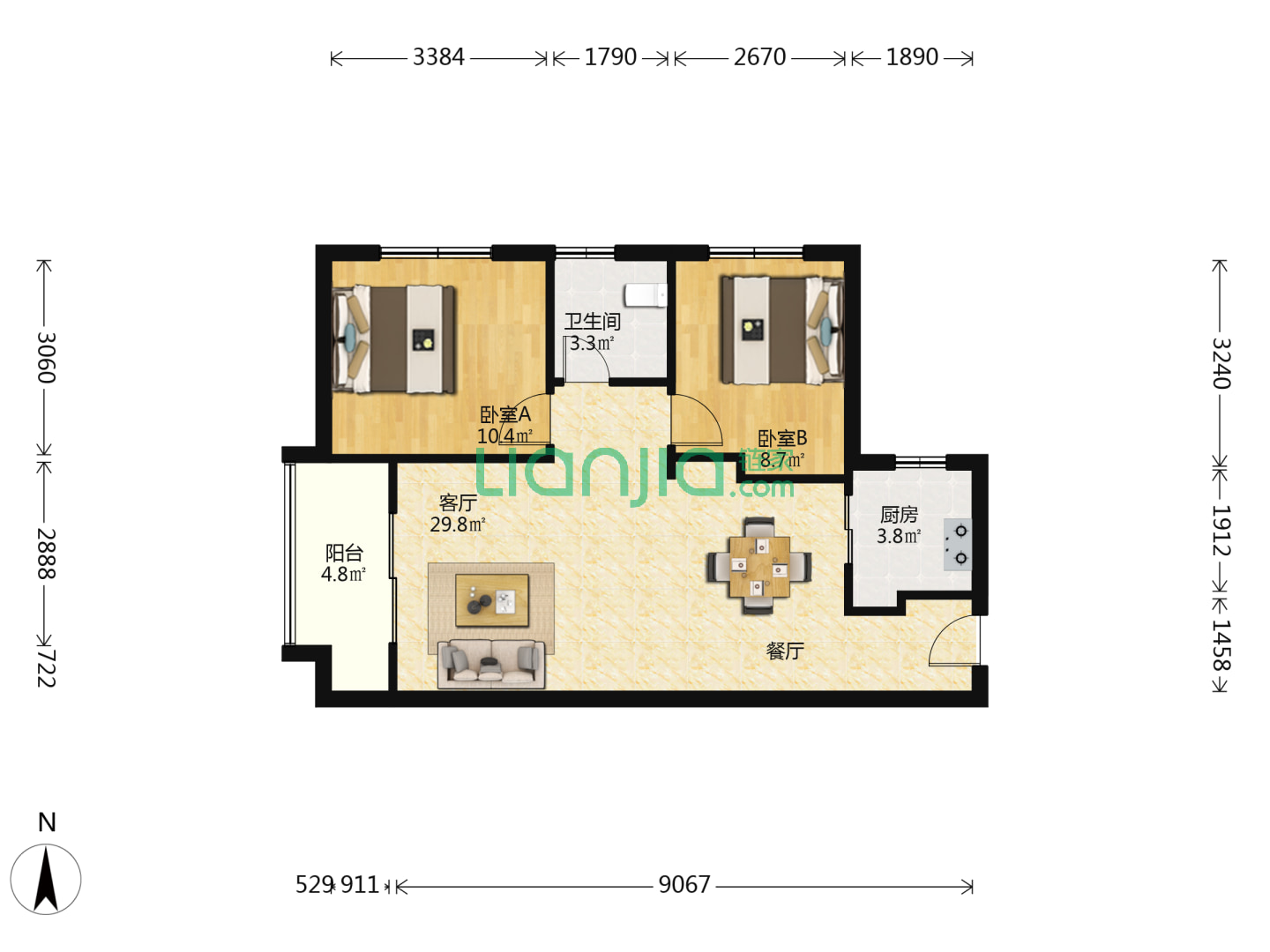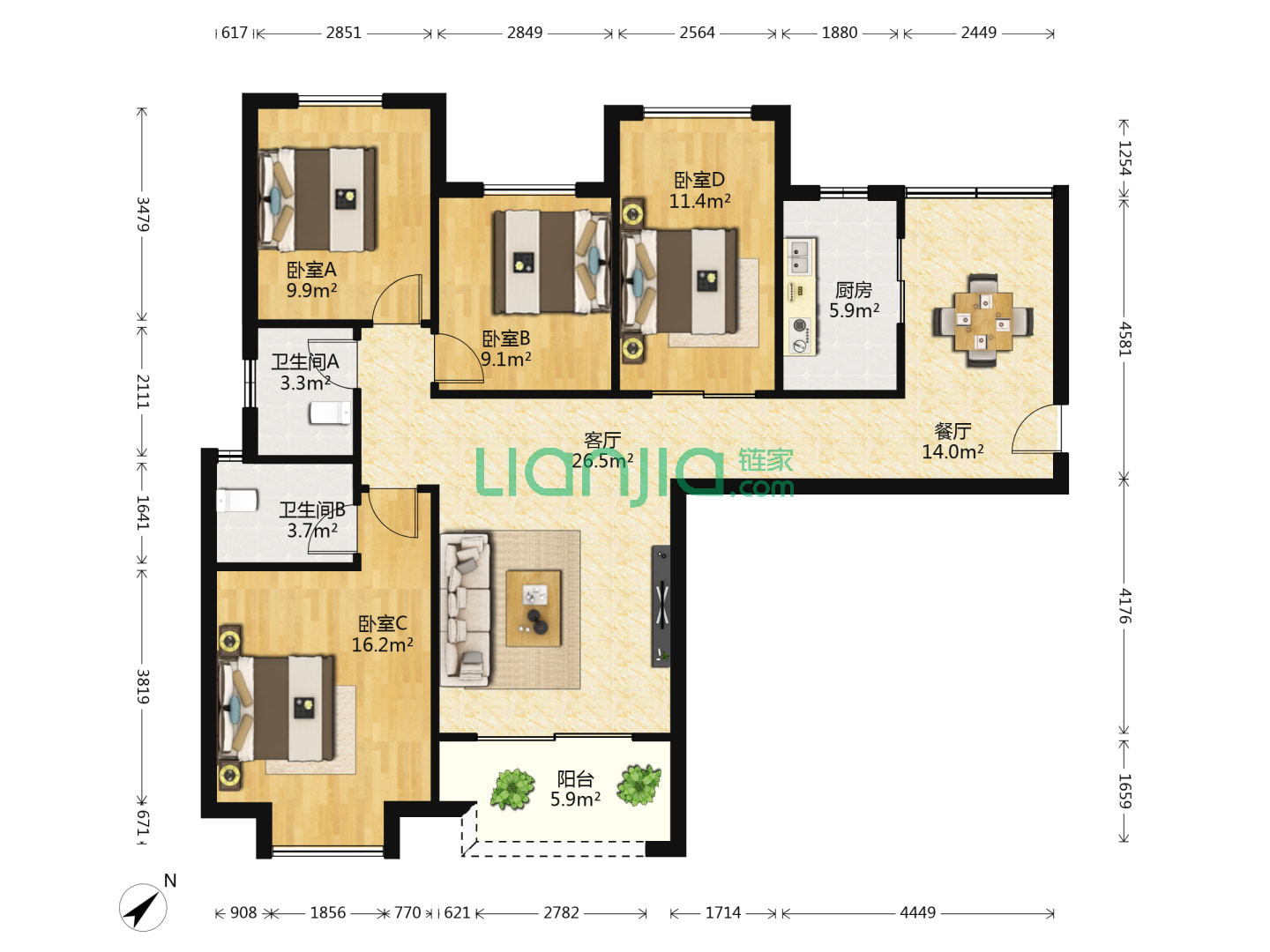 龙湖嘉屿城,3室2厅2卫 90㎡